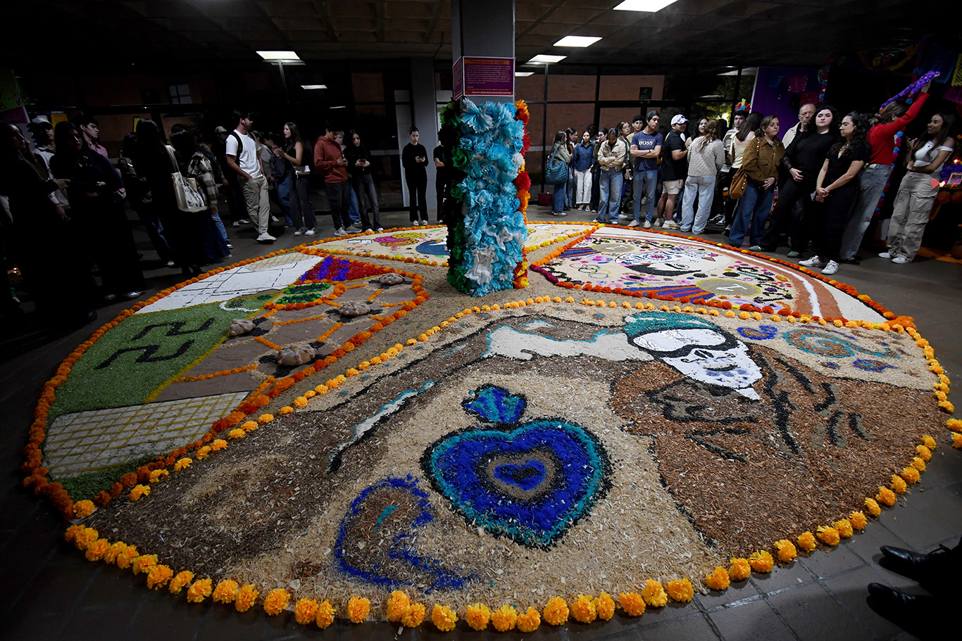 En el vestíbulo se instaló una veintena de altares dedicados a deportistas guanajuatenses y una serie de tapetes tradicionales; una columna fue decorada con el tema de los cuatro elementos, aire, tierra, agua y fuego, como símbolo de equilibrio y conexión entre la vida y la muerte. Los cuatro puntos cardinales evocaron la cosmovisión mesoamericana que unen la naturaleza con la memoria.