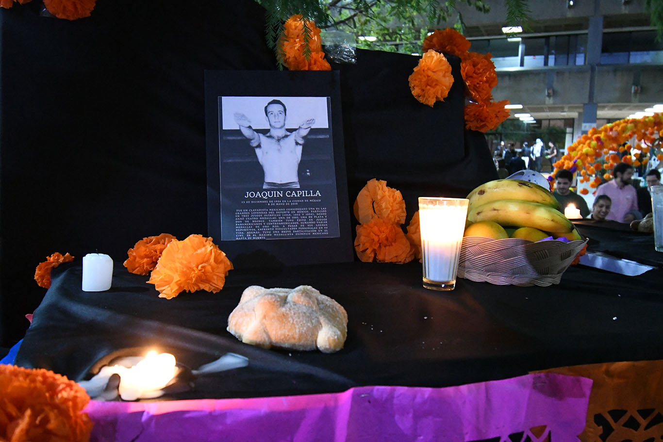 La alumna Sofia Anaya Jiménez, de la Licenciatura en Diseño de Producto, explicó la inspiración de la magna ofrenda instalada en el patio, titulada ‘Zona deportiva del mundo de los muertos’, “un espacio donde el espíritu del deporte sigue vivo, donde la pasión y disciplina de los atletas mexicanos trascienden en el tiempo”.